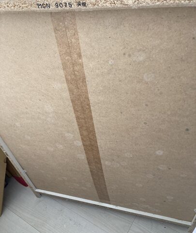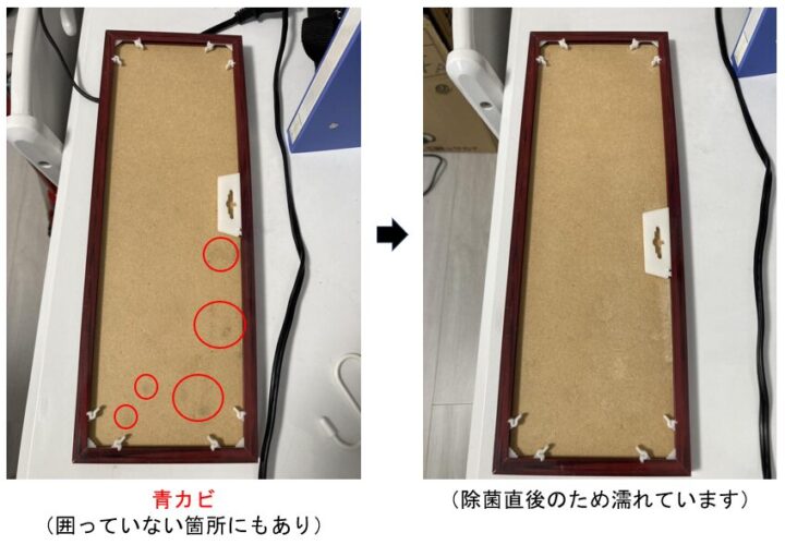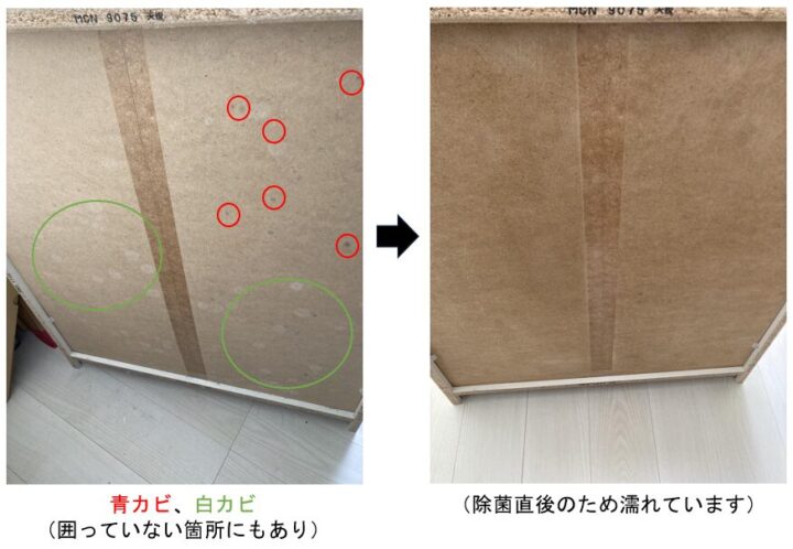 施工前は、棚の裏に青カビや白カビの発生が見られました。