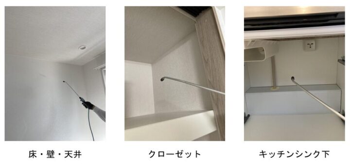 噴霧工程では、床・壁・天井、クローゼット、キッチンのシンク下などを中心に施工を行いました。