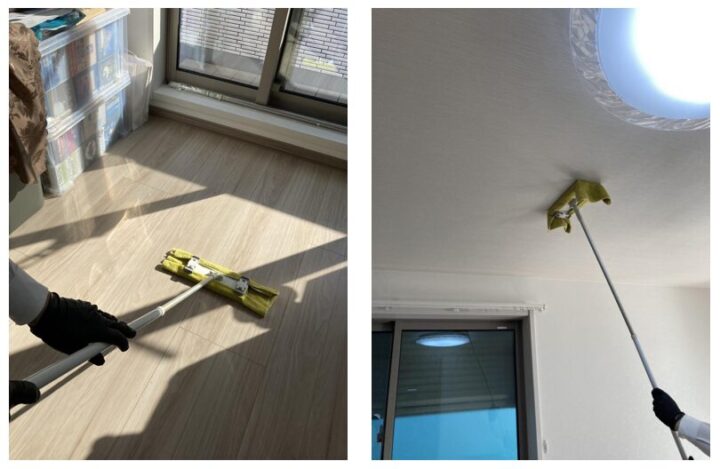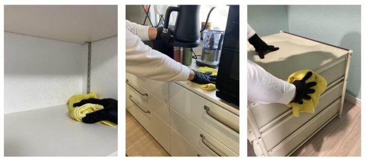 クローゼット内、ラック、引き出し、ドアまわりなども含めて対応し、各所の状態に合わせて丁寧に拭き上げています。