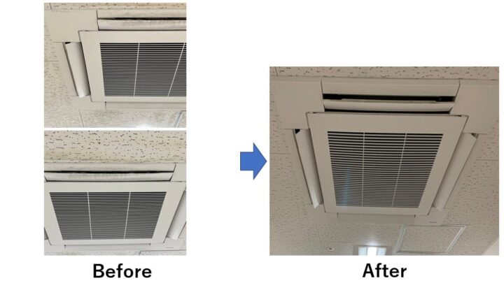 施工後は、吹出口まわりと天井面の汚れが改善され、空調設備まわり全体がより衛生的な状態に整いました。